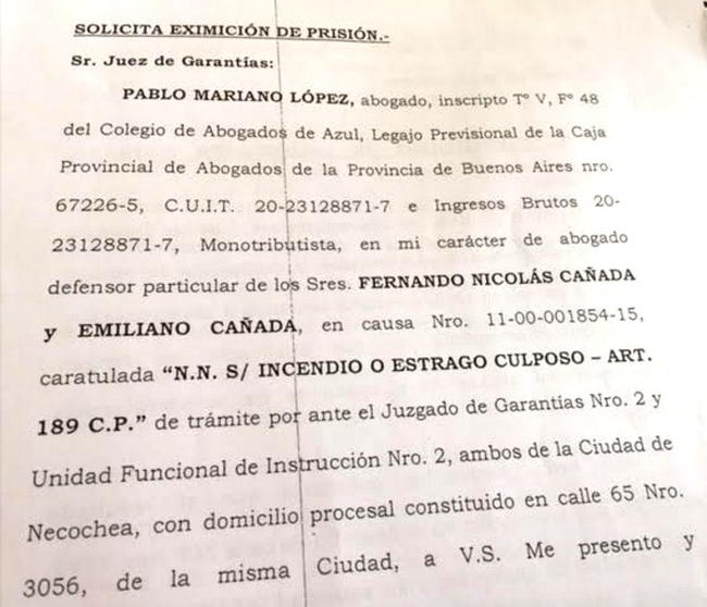 Quien habría firmado el pedido de eximición de prisión en aquella oportunidad fue el mismo abogado, el Dr. Pablo López.