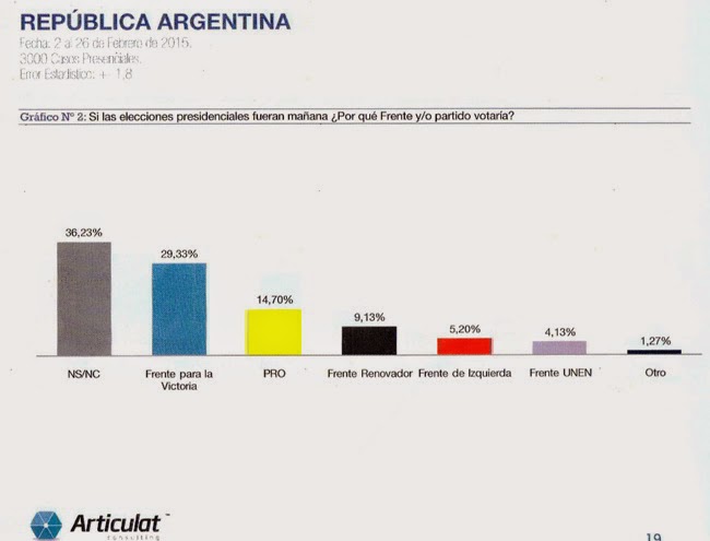 Según la encuesta de Articulat, «si las elecciones presidenciales fueran mañana» el espacio político que actualmente gobierna nuestro país sería reelecto con el 29.33%. En segundo lugar se encuentra el PRO con un 14.70%, seguido por el Frente Renovador con un 9.13%. Sorprendentemente, el Frente de Izquierda mide mejor que la opción que contenía a la UCR al momento de la encuesta: 5,20% para los partidarios de Altamira contra 4,13% de los radicales.