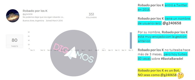 Cada empleado de un call center maneja cientos de cuentas en las redes sociales, con el objetivo de influenciar en la opinión pública. La tecnología actual permite rastrear el movimiento de cada cuenta y detectar cuándo es una cuenta falsa o no. En las imágenes que se adjuntan se puede observar cómo se llevó adelante la campaña contra el dirigente Baradel, precisamente cuando el conflicto docente no se resuelve y es una de las mayores preocupaciones de la sociedad. Ahora ¿a quién responsabilizamos de que no se resuelva el conflicto?