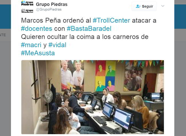 Ya se han hecho las denuncias en la justicia respecto de la existencia de uno o varios call center coordinados por el Jefe de Gabinete de Ministros, Marcos Peña, cuya función es influenciar en la opinión pública con informaciones falsas o denigrantes.