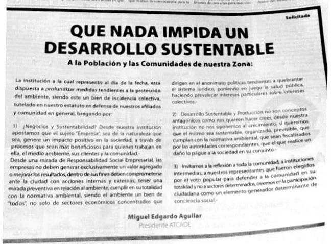 2) Desarrollo Sustentable y Producción no son conceptos antagónicos como nos quieren hacer creer, desde nuestra institución no nos oponemos al crecimiento, si queremos que el mismo sea sustentable, organizado, previsible, que cumpla con la normativa ambiental, que sean fiscalizados por las autoridades correspondientes, que el que realice un daño lo pague a la sociedad en su conjunto.