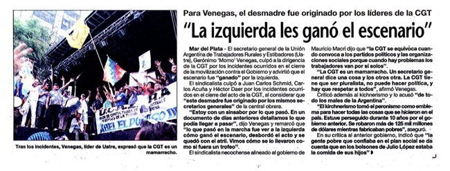 Venegas obvió la protesta generalizada y recortó lo ocurrido a un incidente provocado por la izquierda, señalándola tal como hacía el viejo sindicalismo buchón cuando mandó al muere a miles de trabajadores antes (colaborando con la Triple A) y durante la dictadura militar (colaborando con los grupos de tareas).
