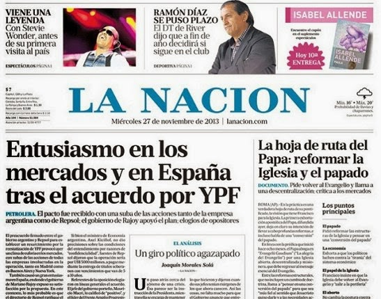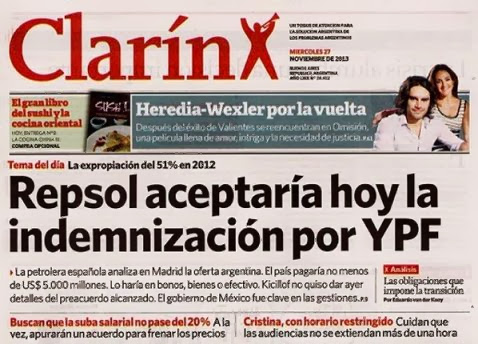 En las tapas de La Nación y Clarín de la jornada de hoy, ningún título negativo: el multimedios aplaude las nuevas decisiones del gobierno respecto del millonario resarcimiento económico a la empresa española Repsol por la recuperación para el patrimonio nacional de la petrolera YPF.