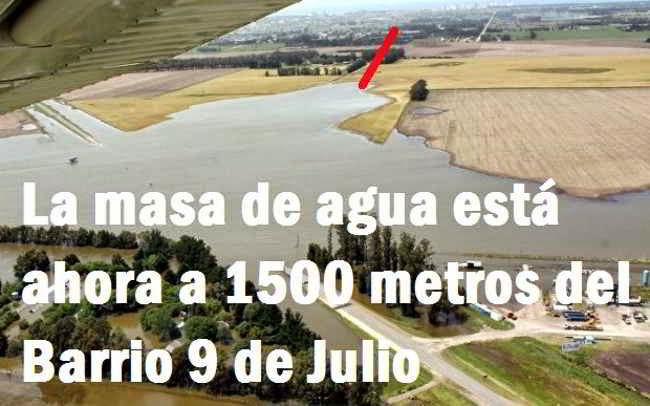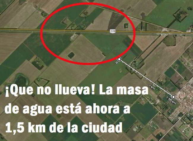 Este fin de semana, el periódico Ecos Diarios publicó una fotografía que, mirada en detalle, hiela la sangre: si bien el agua que cubre la ruta 228 bajó 10 o 20 centímetros en los últimos días, se puede observar como avanzó peligrosamente la masa hídrica unos cuantos metros hacia la ciudad. Ahora, según la imagen, el agua está a sólo 1500 metros del Barrio 9 de Julio.