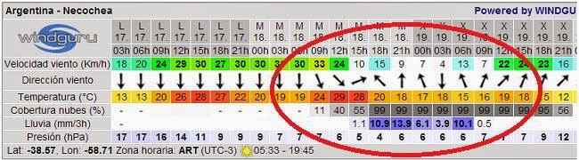 Los pronósticos del Windgurú no son halagüeños: se puede observar que para este martes 18 y el miércoles por la mañana se esperan lluvias intensas en la zona.