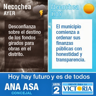 Hay que decirlo: es muy seria la insinuación de corrupción que realiza la gráfica de la campaña de Asa con respecto al año de tellecheísmo en el poder municipal: «Desconfianza sobre el destino de los fondos girados para obras en el distrito». Por si quedaran dudas, otro mensaje diferente para la actual gestión: «El municipio comienza a ordenar sus cuentas con honestidad y transparencia».