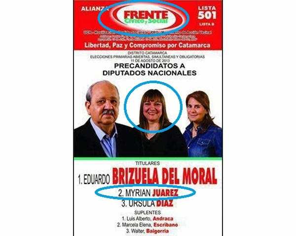 La segunda de la lista 501 fue extrapartidaria: Myriam Juárez, ex titular del RENATRE de Catamarca, es actualmente la referente de la UATRE de esa provincia. Gerónimo Venegas impulsó desde siempre a Juárez para incursionar en la política y hasta ahora, la lealtad fue correspondida con el líder del Partido Fé y de los empleados rurales.