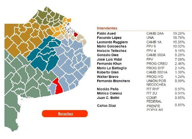 Cerrados los resultados definitivos de las primarias abiertas, simultáneas y obligatorias para disputar la intendencia de Necochea, nuestro distrito perfila 5 candidatos que competirán en las elecciones generales del 25 de Octubre: Pablo Aued por Cambiemos, Facundo López por el UNA, Mario Goicoechea por el FpV, Fernando Khun por el frente Progresistas y Nicolás Peña por el FIT.