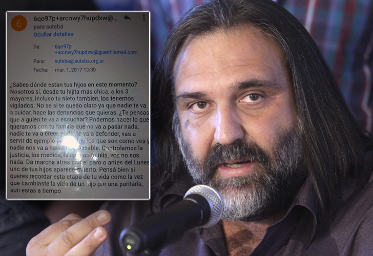 «¿Sabés donde están tus hijos en este momento? Los tenemos vigilados ya que nadie te va a cuidar. Hacé las denuncias que quieras. Podemos hacer lo que querramos. Controlamos la justicia, los medios y la opinión pública. Da marcha atrás con el paro del lunes o uno de tus hijos aparece muerto», dice parte del mail que recibió Baradel y presentó en Tribunales como prueba.