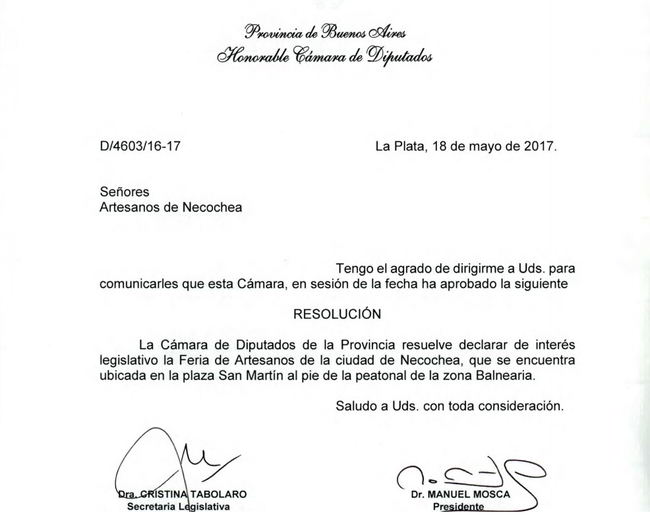 La Cámara de Diputados de la Provincia de Buenos Aires aprobó la Resolución D/4603/16-17 que resuelve declarar de Interés Legislativo la Feria de Artesanos de la Ciudad de Necochea.