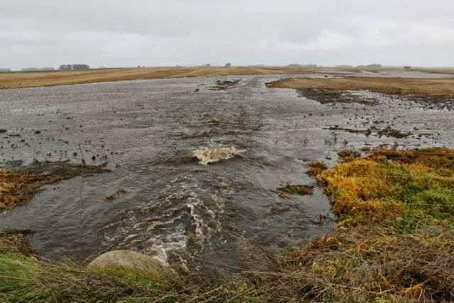 El agua de los campos está buscando la salida al mar, por lo que el desborde de los canales está complicando aún mas la situación. Se aguarda una masa agua abundante a medida que pasen las horas.