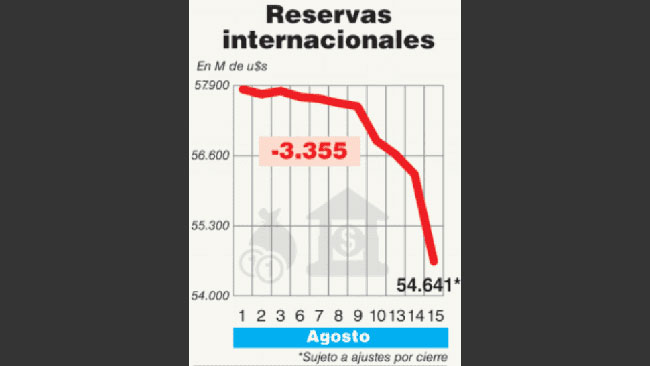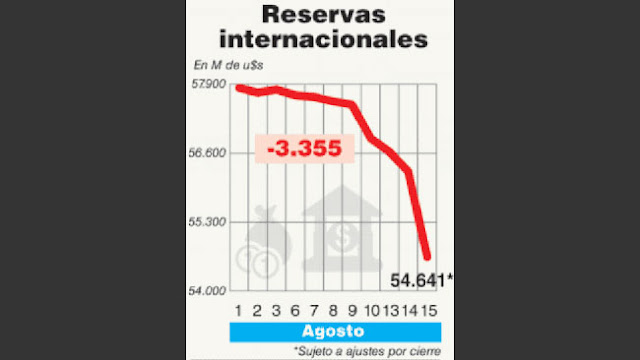 Después de las ventas de dólares que realizó el Banco Central días pasados (15.08.2018), las reservas internacionales de la entidad cerraron el día con una caída de u$s 1.617 millones. Así, las tenencias en moneda extranjera de la entidad quedaron en u$s 54.641 millones.