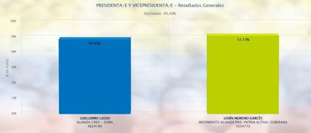 En los comicios realizados el domingo, Lenín Moreno obtuvo el 51,17% de votos, mientras que su rival, el candidato de la derecha Guillermo Lasso, el 48,83%, según los cómputos del Consejo Nacional Electoral que ya ha escrutado más del 99,48% de las actas escrutadas.