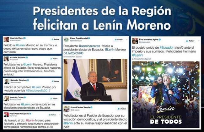 Tras el triunfo del presidente electo, Lenín Moreno, los Jefes de Estado de América Latina expresaron sus saludos con llamadas telefónicas, mensajes públicos (a través de sus cuentas en redes sociales) y mediantes comunicaciones diplomáticas, con lo que reconocieron la victoria sobre el contendor del movimiento CREO, Guillermo Lasso.