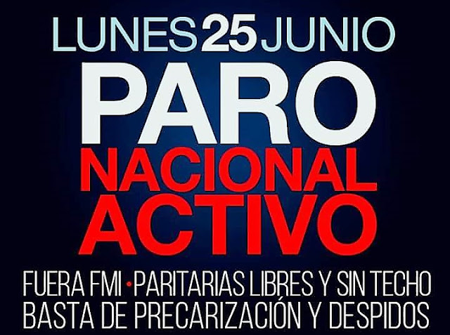 No alcanza con algún paro dominguero de vez en cuando. se necesita con urgencia un plan de lucha con paro y movilización contra la política económica que tiene como objetivo cercenar derechos de los trabajadores, transformarnos en mano de obra mas barata, destruir el mercado interno y las pymes, y dejar condicionado a cualquier gobierno futuro con un endeudamiento acordado con el fmi que resulta suicida.