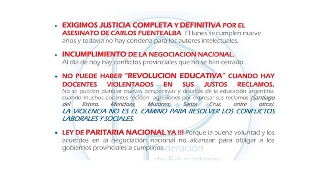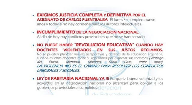 NO PUEDE HABER “REVOLUCION EDUCATIVA” CUANDO HAY DOCENTES VIOLENTADOS EN SUS JUSTOS RECLAMOS. No Se Pueden Plantear Nuevas Perspectivas Y Desafíos De La Educación Argentina, Cuando Muchos Docentes Reciben Agresiones Por Expresar Sus Reclamos (Santiago Del Estero, Mendoza, Misiones, Santa Cruz, Entre Otros). LA VIOLENCIA NO ES EL CAMINO PARA RESOLVER LOS CONFLICTOS LABORALES Y SOCIALES.