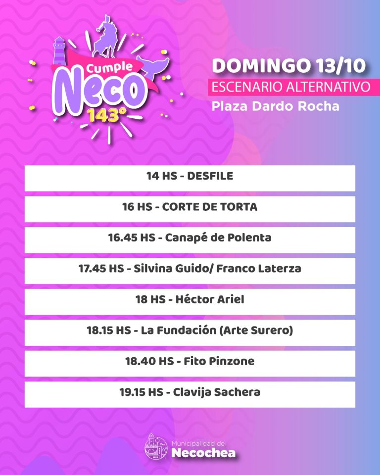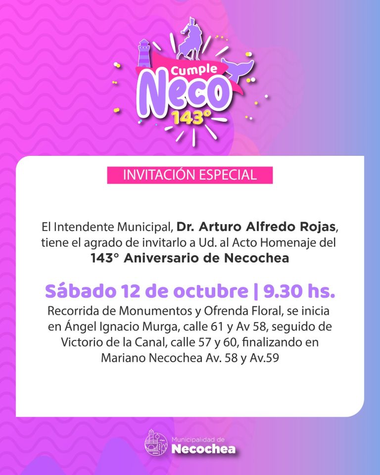 El acto oficial por el 143º Aniversario de la fundación de la ciudad de Necochea se realizará en la mañana del sábado 12 de octubre, a las 9:30, con una recorrida de funcionarios y autoridades que dejarán ofrendas en los monumentos dedicados a Ángel Ignacio Murga, en Avenida 58 y calle 61, donde iniciará la actividad; Victorio de la Canal, en la intersección de 57 y 60; y Mariano Necochea, en la rotonda que une las avenidas 59 y 58.