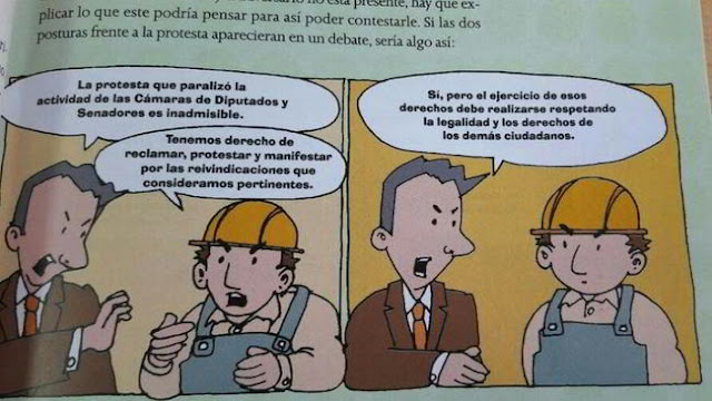 Para complementar la elección de la noticia, el manual publica una particular historieta, donde un hombre de saco increpa a un obrero de la construcción que está realizando una manifestación y le explica que su protesta es “inadmisible”. Ante la respuesta del trabajador, que enfatiza su derecho, en el recuadro siguiente sólo habla el hombre de saco, quien agrega: “El ejercicio de esos derechos debe realizarse respetando la legalidad y los derechos de los demás ciudadanos”.