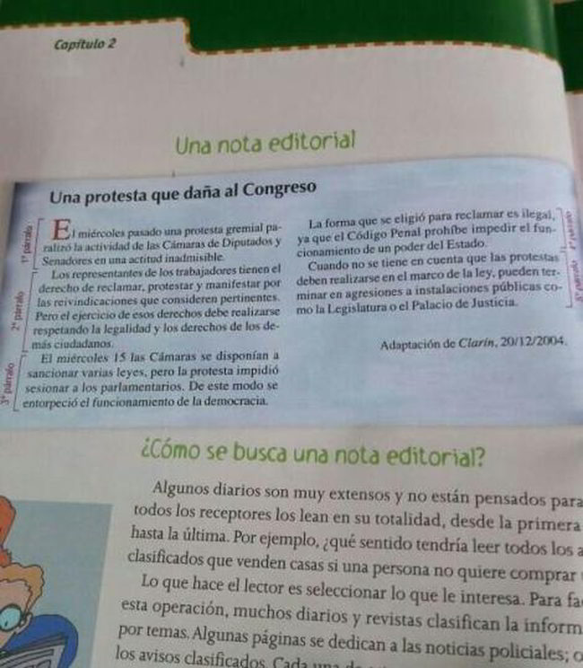 El ministerio de Esteban Bullrich consideró que la mejor forma de explicar las formas lingüísticas de una nota editorial era a raíz de una publicación del diario Clarín, «adaptada», que se titula “Una protesta que daña al Congreso”. El manual toma como ejemplo ese editorial del 20/12/2004, que habla sobre una huelga de trabajadores que paralizó por unos días la actividad en el Congreso, para explicar que las protestas gremiales son “inadmisibles”. El artículo señala que la manifestación es una forma de “entorpecer a la democracia” y considera fuera de la ley a los trabajadores que estaban haciendo sus reclamos.