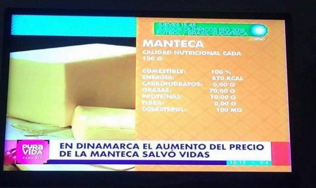 La honestidad de La Nación mata, y sí. Por eso va un poquito más allá y se mete directamente con el alimento diario: “Desayuno: si o no. Pros y contras de la primera comida de cada día”. Que la pobreza no te quite el lujo y si te tirás carne a la parrilla que sea de “asado de caballo” como lo recomienda la tele.  Ojo, también cuidan tu salud, a televisión pública nos da una clase de internacionalismo nutricional y plantea que “En Dinamarca el aumento del precio de la manteca salvó vidas”.
