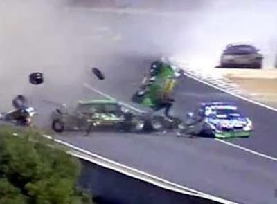 El rebote en las gomas hizo que el Ford Falcon de Falaschi vuelva a quedar en la pista con la mala fortuna de ser chocado de lleno en el centro del vehículo por Néstor Girolami, quien se encuentra internado en terapia intensiva pero estable.