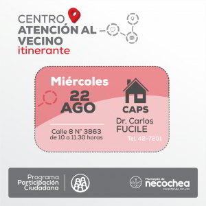 El Centro de Atención al Vecino Itinerante, continuando en la búsqueda de acercar un órgano de consulta municipal a cada barrio de la ciudad, desembarcará este miércoles 22 de agosto en el Centro de Atención Primaria de la Salud “Dr. Carlos Fucile”, ubicado en calle 8 al 3863.