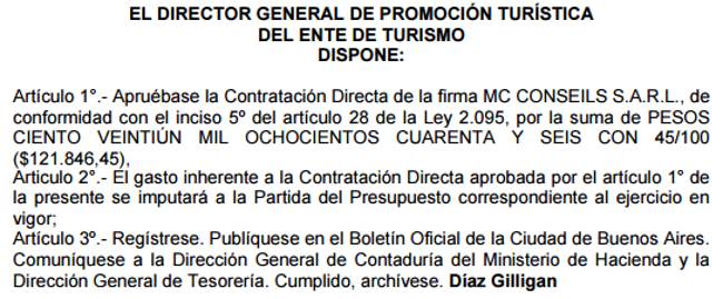 A fines de 2014, desde el Ente de Turismo de la Ciudad de Buenos Aires, en ese entonces a cargo del (ex) cuñado de Macri Fernando de Andreis, el Gobierno le pagó a Colagreco / MC Conseils S.A.R.L. $121.846,45 a través de una contratación directa para que organice el evento “Noche Buenos Aires-Mentón”, esto es: una cena en su propio restaurant de la costa Azul, alegando que el objeto específico de la contratación radica en:
