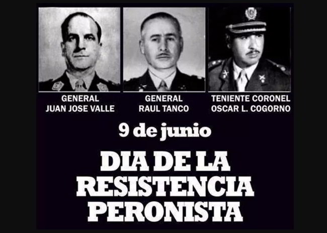 El 9 de junio de 1956, un grupo de militares y civiles al mando de los Generales Valle y Tanco, intentó rebelarse para recobrar la democracia perdida. Pero la rebelión fracasó y el gobierno de facto tomó duras represalias: fusiló a los cabecillas militares y decretó la ley marcial para toda la ciudadanía.