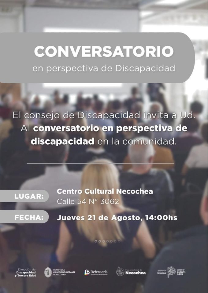 El Consejo de Discapacidad de la Municipalidad de Necochea invita a la comunidad a participar de un Conversatorio sobre la Perspectiva de Discapacidad, que se realizará este jueves 21 de agosto a las 14 hs en el Centro Cultural de Necochea (calle 54 Nº 3062).