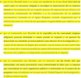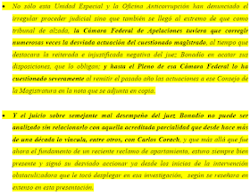 «Pero no puedo menos que mencionar la sorpresa que merece contrastar la actitud militante en la presente causa, al compararla con la evidenciada en la investigación de otra causa a su cargo: la del encubrimiento de la investigación del atentado a la AMIA, quizá la causa de mayor relevancia institucional de las últimas décadas. Y digo esto porque conozco los pormenores de la actuación de V.S. al haberlo denunciado personalmente por su mal desempeño. En efecto, comparando ambos procesos, sorprende la celeridad y decisión con que encaró la presente investigación. Y sorprende, porque claramente esta actitud no es un denominador común en el desempeño de V.S. en la gestión de la causa en que ha sido por mí denunciado».(…)