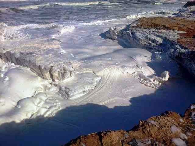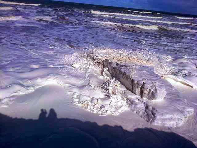El fenómeno llama la atención a pesar de no ser novedoso: en algunos sectores de la playa de Quequén, el agua que golpea las rocas se volvió blanco, con una consistencia casi cremosa.