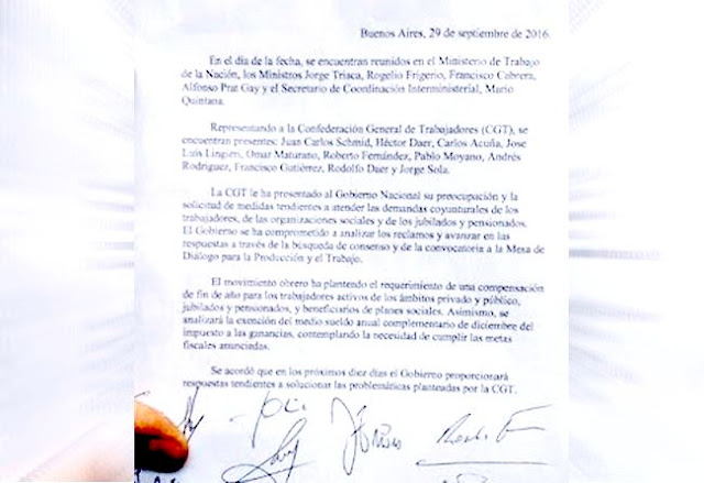 El entendimiento, que deberá traducirse en medidas para ser anunciadas en diez días, implicará por parte de la central obrera desactivar la amenaza de paro nacional y una garantía de paz social.