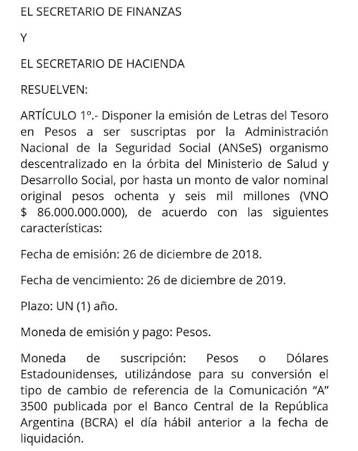 El Gobierno oficializó hoy la emisión de Letras del Tesoro por hasta 86 mil millones de pesos, a un año de plazo, que serán suscriptas de manera directa por la ANSeS. La decisión se tomó a partir de una resolución conjunta de las Secretarías de Finanzas y de Hacienda, publicadas este miércoles en el Boletín Oficial.