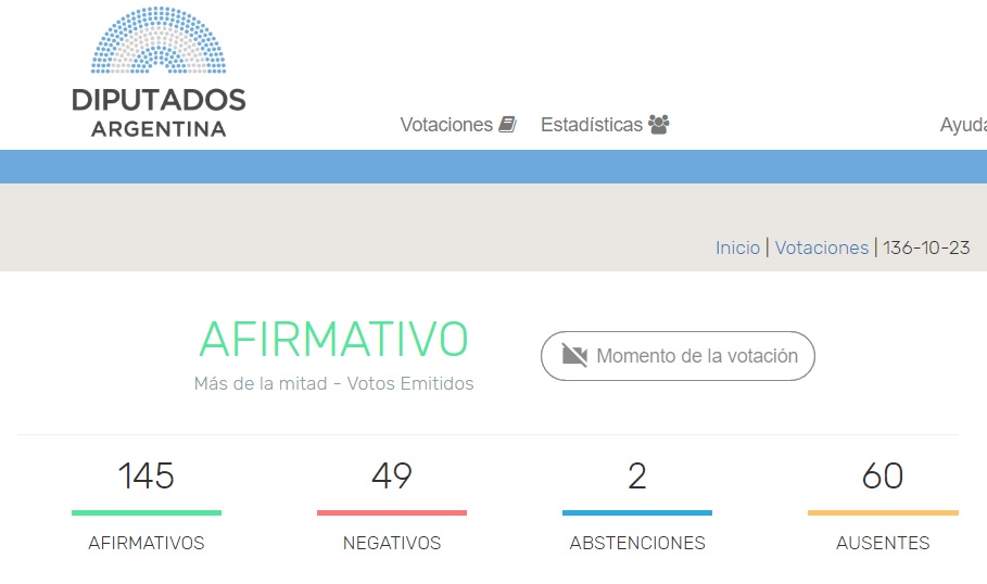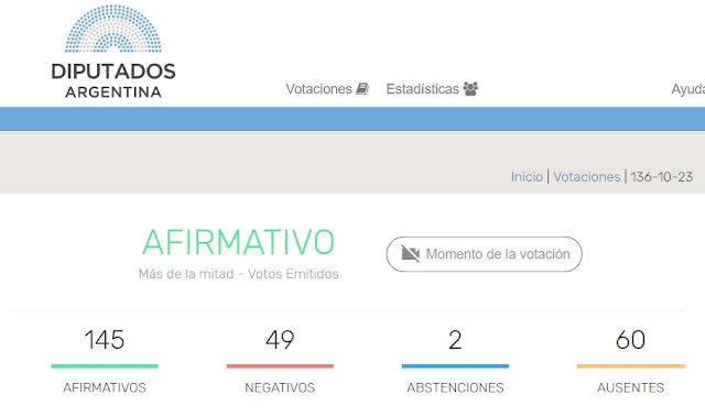 En Diputados, la ley ahora fue aprobada con 145 votos afirmativos, 48 negativos y dos abstenciones. Tuvo el apoyo de las bancadas del PRO, UCR, UNA, algunos Justicialistas provinciales y el Movimiento Evita. Tuvo el rechazo rotundo de la bancada del FPV-PJ y el FIT.