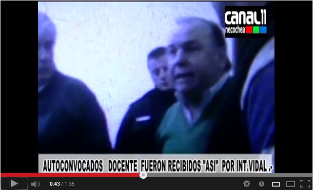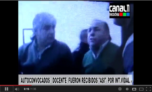 Un lamentable episodio se dio en el mediodía de hoy cuando un grupo de docentes autoconvocados se manifestó en el palacio municipal: el interino Vidal salió de su despacho molesto por el batir de los bombos y los cánticos y, fuera de sí, empezó a los gritos contra los maestros y profesores que pedían que alguien interceda para poder cobrar sus cinco meses de sueldos atrasado