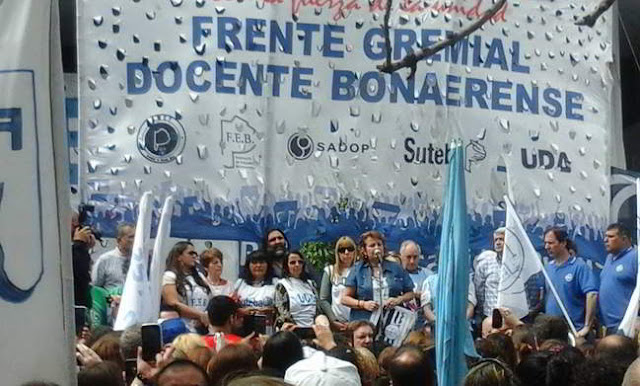 Los docentes bonaerenses de Feb, Suteba y los otros sindicatos que conforman el Frente Gremial marcharon esta mañana en la ciudad de La Plata para realizar un abrazo simbólico al edificio donde funciona el Instituto de Previsión Ssocial (IPS), la caja de jubilaciones de los empleados públicos de la provincia de Buenos Aires.