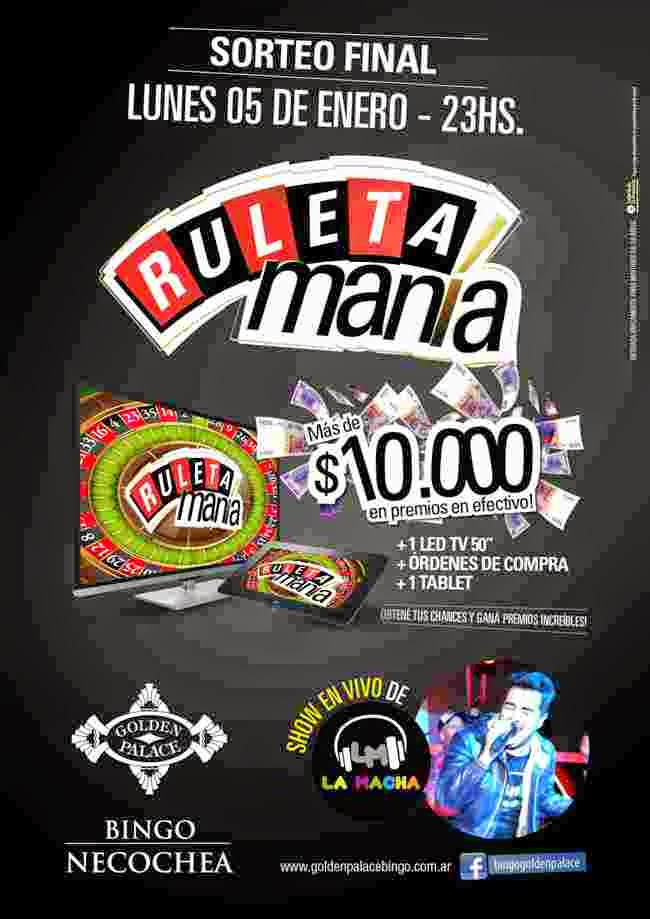 El día Lunes 5 de Enero de 2015, a partir de las 23 hs se llevará a cabo el tan esperado Sorteo Final de la Promo “Ruletamanía”, considerada la promo con mayor audiencia del año en Bingo Golden Palace, y cerrará con un gran show musical en vivo del grupo “La Macha“, quienes darán un toque festivo al “Gran Cierre” de la Promo.