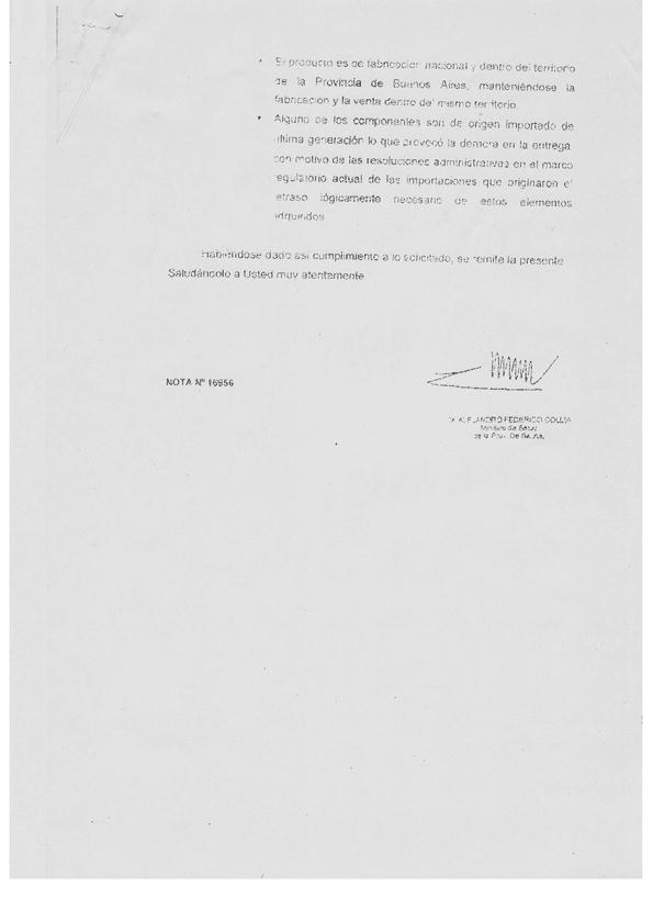* Alguno de los componentes son de origen importado de última generación lo que provocó la demora en la entrega, con motivo de las resoluciones administrativas en el marco regulatorio actual de las importaciones que originaron el retraso lógicamente necesario de estos elementos adquiridos.