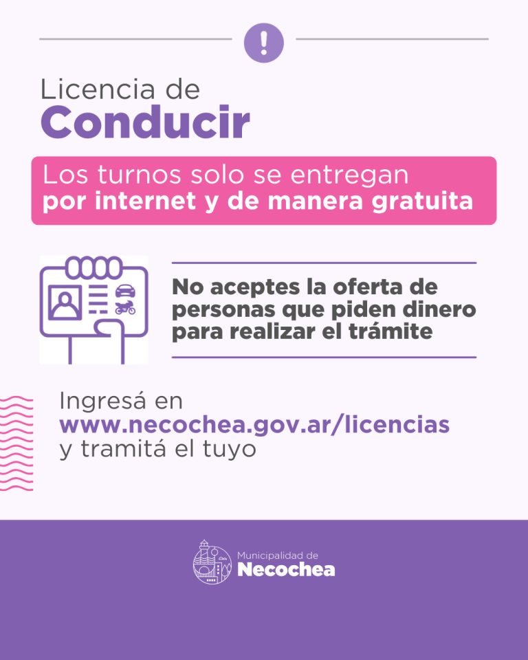 Habiendo detectado la oferta no autorizada de personas ajenas al municipio que ofrecen gestionar turnos para la obtención de licencias de conducir, la Municipalidad de Necochea recuerda a los vecinos que el trámite de turnos se realiza únicamente de manera online y de forma gratuita, por lo que no hay ningún gestor autorizado para tramitar turnos de licencias.