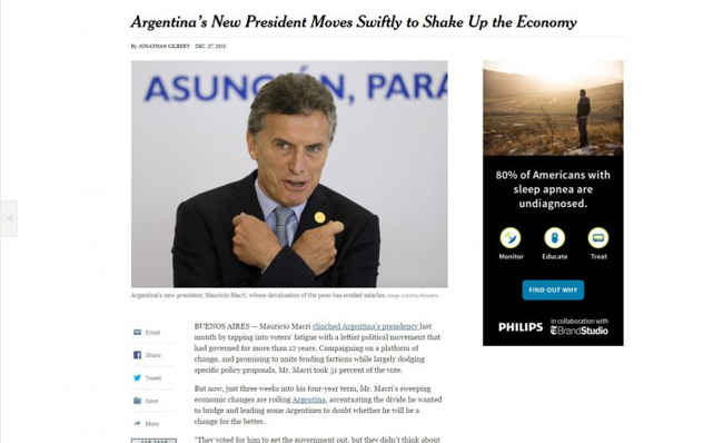 Las medidas económicas que tomó el flamante gobierno de Mauricio Macri no fueron tan bien recibidas en el exterior, al menos por lo que se deduce de la última nota que el diario estadounidenseNew York Times publicó sobre el país luego del triunfo de Cambiemos, en la cual destaca el impacto negativo sobre los asalariados.