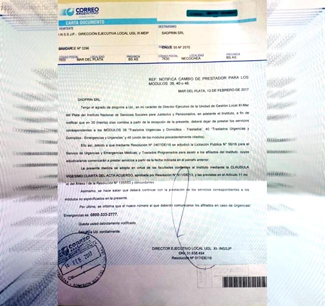 Con el remitente de la Dirección Ejecutiva de la región Mar del Plata del Instituto Nacional de Servicios Sociales para Jubilados y Pensionados (INSSJP) fechada el pasado lunes 13 de febrero de 2017, el PAMI «notifica cambio de prestador» a la empresa local de Emergencias médicas Sadprin SRL.