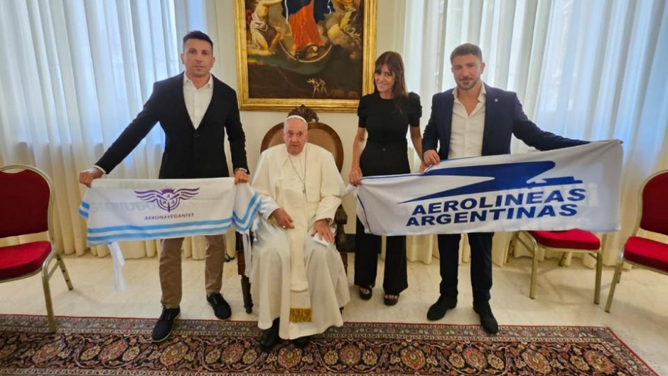 El líder religioso recibió este miércoles en el Vaticano a una comitiva del sindicato de Aeronavegantes y posó para la foto con una bandera de Aerolíneas, asumiendo una postura muy clara respecto al debate que se estaba dando al mismo tiempo en Argentina.