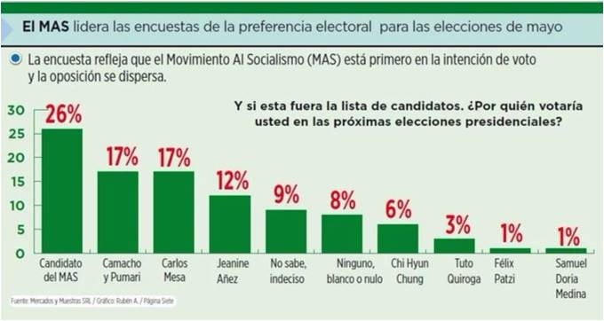 De cara a las elecciones presidenciales del 3 de mayo, una encuesta asegura que el Movimiento Al Socialismo (MAS), el partido del expresidente Evo Morales, encabeza la intención de voto con el 27% mientras la oposición se dispersa. El estudio fue realizado por la consultora Mercados y Muestras y divulgada por el diario Página Siete de Bolivia.