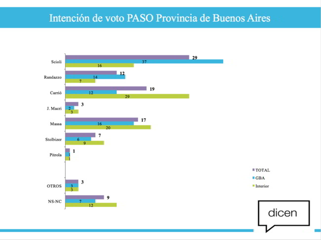 En la encuesta de la consultora Dicen, Elisa Carrió logró una intención de votos de 19 puntos, superando por dos puntos a Sergio Massa que sólo obtuvo un 17%, lo que confirma que su figura va cayendo ante el crecimiento de los candidatos de Cambiemos, al competir por los mismos votantes.