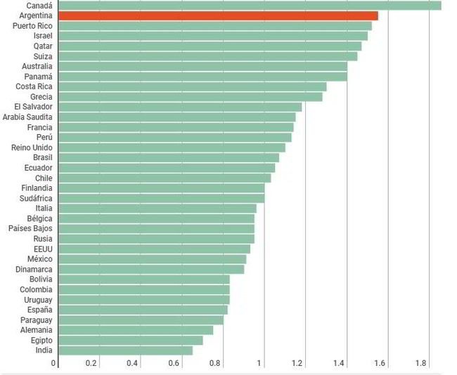 En un ranking (descendente) de 36 países referentes, Argentina ostenta el segundo lugar -superado solamente por Canadá- en el precio de venta de este producto.