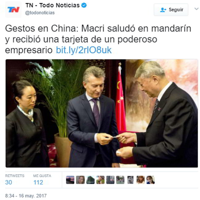 Desde el medio hegemónico que acompaña al presidente en la gira, festejaron con bombos y platillos que Macri pudo memorizar la frase “nĭ hăo” para saludar a sus socios chinos y que luego recibió una tarjeta de parte de un empresario oriental.