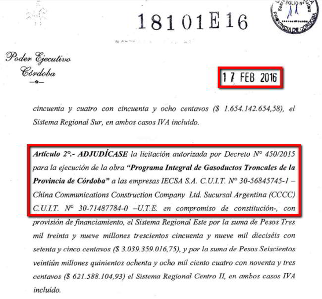 CCCC en Argentina: Son contratistas del Estado y socios de IECSA a través de la conformación de una UTE con la que adjudicaron la construcción del segundo tramo del gasoducto troncal de la Provincia de Córdoba. La empresa sindicada como posible proveedora de las casas chinas prefabricadas “SANY”, es accionista de CCCC por lo que ambos son socios comerciales de larga data y el interés en dicho negocio es mutuo.