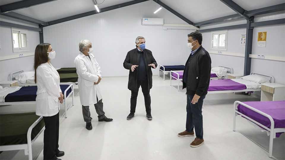 El presidente Alberto Fernández visitó esta tarde un hospital de campaña que será destinado a la atención de pacientes con coronavirus en el polideportivo municipal de Vicente López, junto al intendente Jorge Macri.