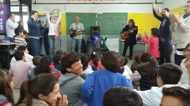 Este martes 23 de mayo le tocó el turno a la EP Nº 49 de la ciudad de Quequén. Allí, el reconocido músico local «Chino» Ibarguren se hizo presente junto a Marcela García Loyoy, quien acompañó la jornada musical contando cuentos a alumnos de 5º y 6º año.