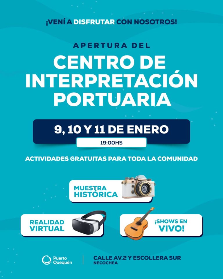 El Puerto inaugurará oficialmente el Centro de Interpretación Portuaria con tres jornadas abiertas a toda la comunidad. La actividad se desarrollará los días 9, 10 y 11 de enero, a partir de las 19 horas, con entrada libre y gratuita, en la calle 2 y la escollera sur, en el predio donde anteriormente funcionaba Puerto Gardella.